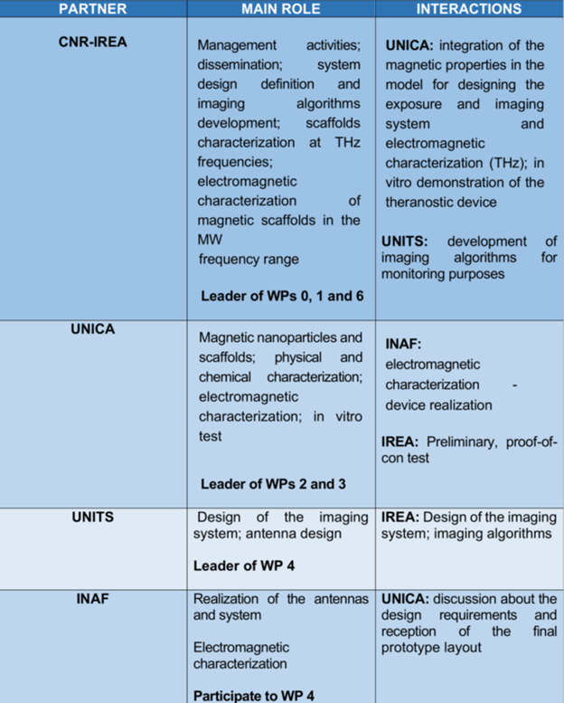By gathering researchers with different backgrounds, the consortium will provide the multidisciplinary knowledge required by the project’s activities, which involves electromagnetics, signal processing and imaging, bioengineering, materials chemistry, chemical and materials engineering and biology. The role of each unit and integration is summarized in Table 1, while the specific contributions and expertise are detailed in the following.